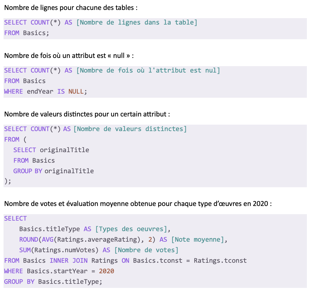 Cette image présente plusieurs requêtes SQL que j’ai rédigées pour analyser la base de données et répondre aux besoins du commanditaire. On y voit des instructions comme le comptage du nombre de lignes (COUNT()), la détection des valeurs nulles (IS NULL), le calcul de titres distincts, ou encore la moyenne des évaluations (AVG()) et le total des votes par type d’œuvre pour l’année 2020.