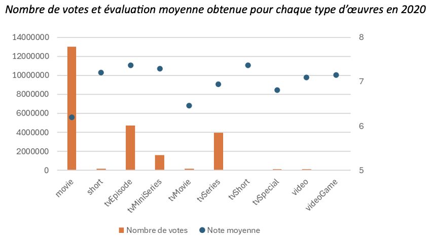 Il permet une lecture rapide et visuelle des tendances : les films (movie) obtiennent le plus de votes, mais les mini-séries (tvMiniSeries) ou les courts-métrages (short) ont souvent de meilleures notes moyennes.