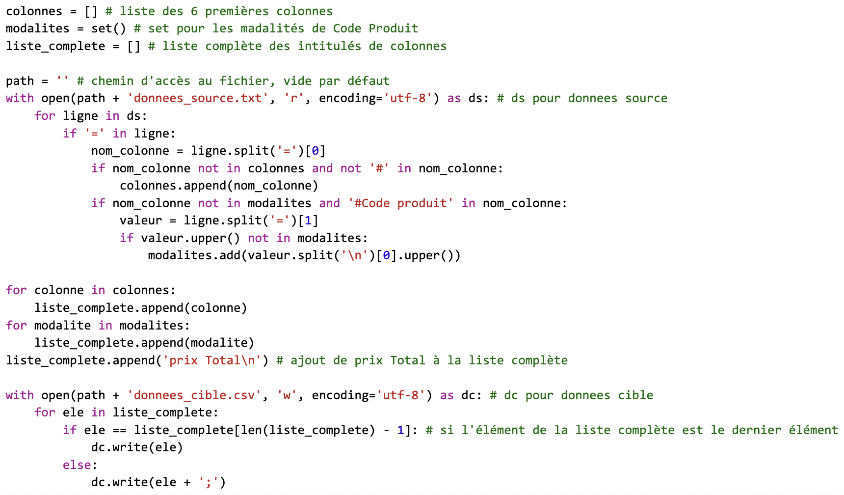 Cette capture d’écran montre le script Python développé pour traiter automatiquement un fichier texte brut. Il lit chaque ligne, extrait les noms de colonnes et les modalités de Code produit, puis construit dynamiquement une liste complète d’en-têtes insérée dans le fichier cible.