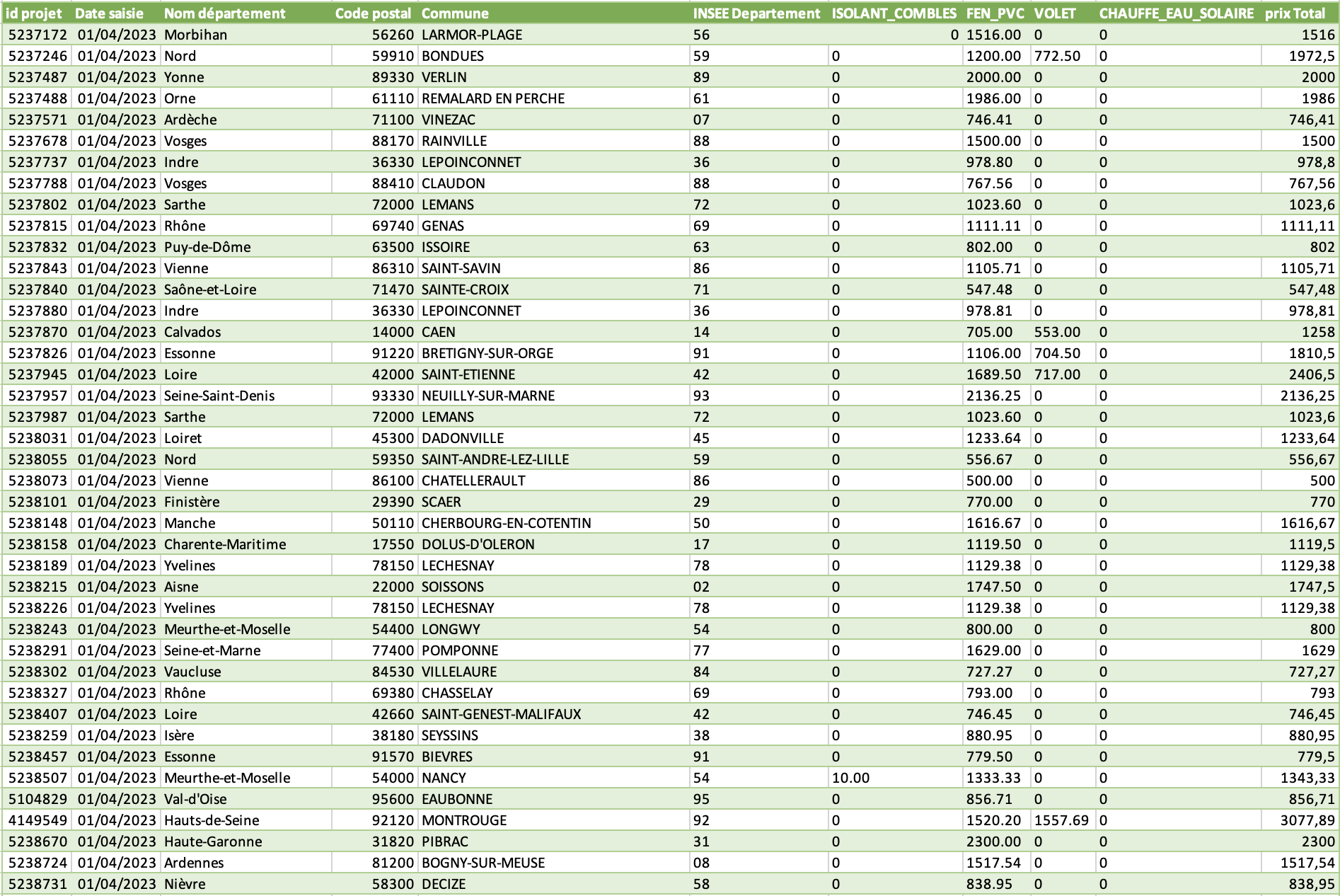 Cette image illustre le fichier CSV généré à l’aide du script. On y voit que les données sources ont été réorganisées selon les modalités extraites, et enrichies avec une colonne "prix Total" calculée automatiquement.