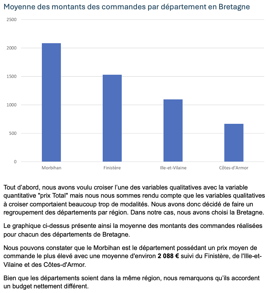 Ce graphique présente la moyenne des montants des commandes pour chaque département de Bretagne, à partir des données traitées dans le fichier généré. Il repose sur l’exploitation de la colonne "prix Total" ajoutée automatiquement par le script.