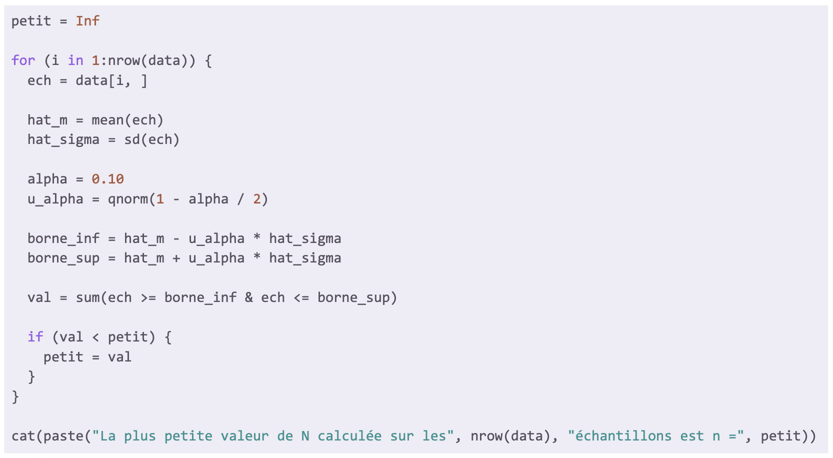 Cette capture d’écran illustre un script R que j'ai développé pour déterminer la plus petite valeur de N (nombre d’observations) à retenir lors d’une estimation par échantillonnage. Le code parcourt chaque ligne d’un jeu de données et calcule la moyenne (hat_m) et l’écart-type (hat_sigma), puis déduit les bornes de l’intervalle de confiance à un niveau alpha choisi (ici, alpha = 0.10). Ensuite, le code identifie le plus petit nombre de valeurs qui restent incluses dans cet intervalle et affiche ce résultat.