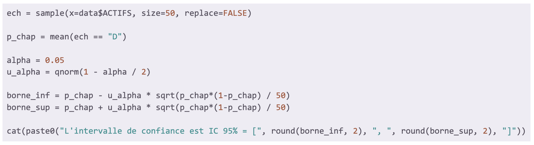 Cette capture d’écran illustre un script R conçu pour calculer un intervalle de confiance à 95 % pour une proportion estimée à partir d’un échantillon aléatoire tiré d’un autre jeu de données. Le code sélectionne un échantillon de taille 50, puis calcule la proportion observée ayant un caractère particulier (ici D). Ensuite, il déduit les bornes inférieure et supérieure de l’intervalle en utilisant la formule de l’intervalle (loi normale), et affiche le résultat.
